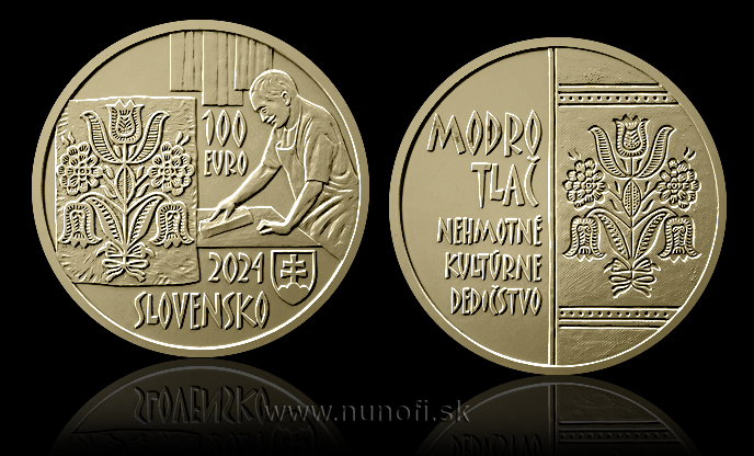 The National Bank of Slovakia announced a competition in December 2023 for the design of a gold collector's coin with a value of 100 euros themed around Slovakia's Intangible Cultural Heritage – Modrotlač. The technique of dyeing textiles has been popular in Slovakia for centuries. It is a specific process where a pattern is applied to the fabric using a special paste that does not capture the blue color of indigo during dyeing. This results in characteristic white ornaments on a dark blue background, which are a popular element of Slovak folk art. Modrotlač is also listed on the UNESCO Intangible Cultural Heritage list. This coin will join the 100 € coin from 2021 dedicated to the fujara. Fifteen authors participated in the competition for the artistic design of the coin with eighteen proposals, which the committee evaluated in May 2024, with ethnologist Oľga Danglová as an expert advisor. The winning design by Karol Lička depicts a detailed modrotlač floral ornament, crafted into relief, authentically reflecting the original patterns. The right side of the coin captures the modrotlač fabric and its manufacturer, paying tribute to the craft and its creators. Second place was awarded to Miroslav Schovanec and third place to Peter Valach. The coin will reach collectors in a limited edition of 6000 pieces in December 2024. This coin is a way for Slovakia to commemorate the significance of modrotlač as a precious symbol of national pride and craftsmanship, which should not fall into oblivion. L.V.